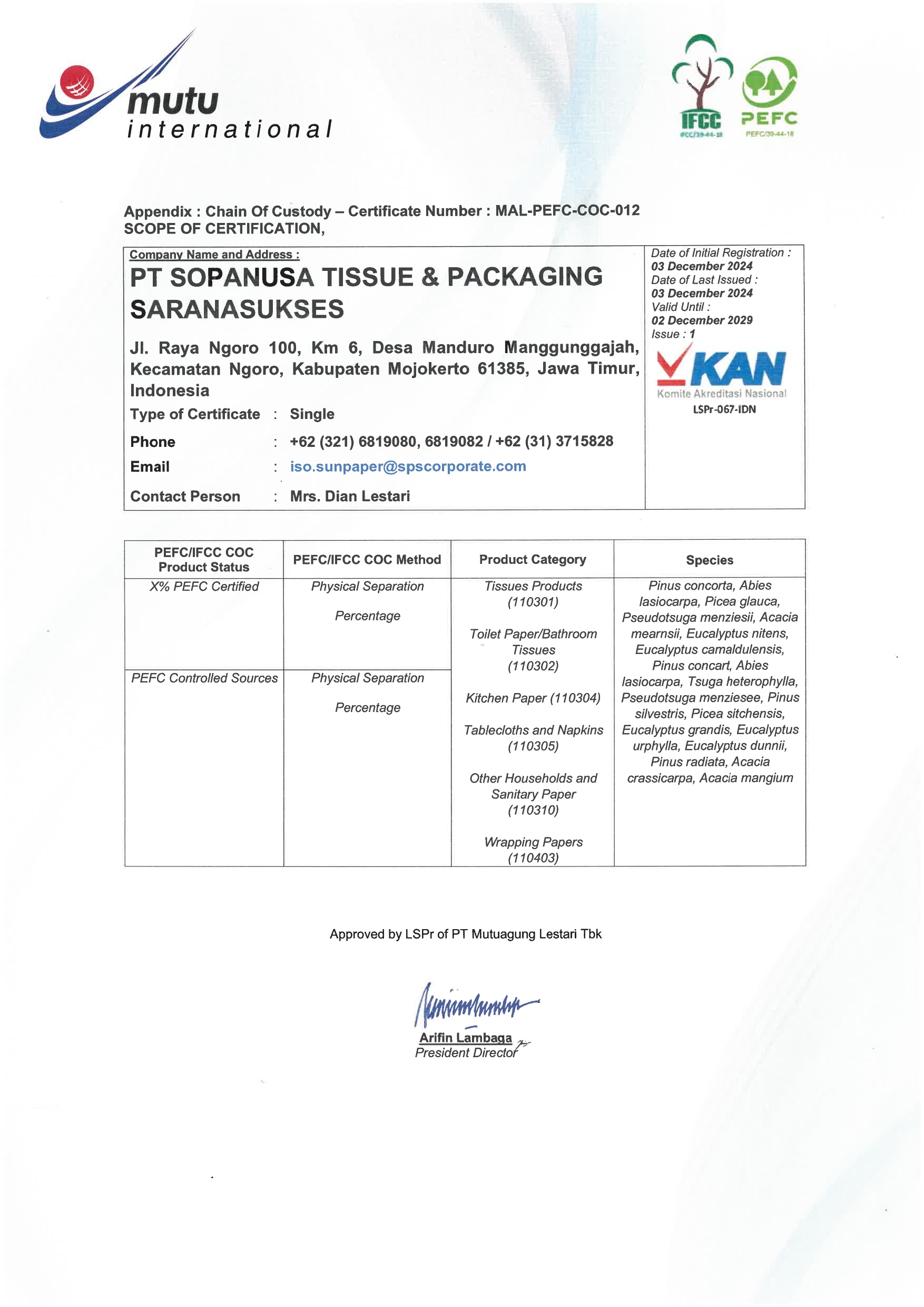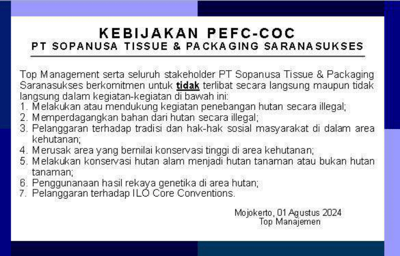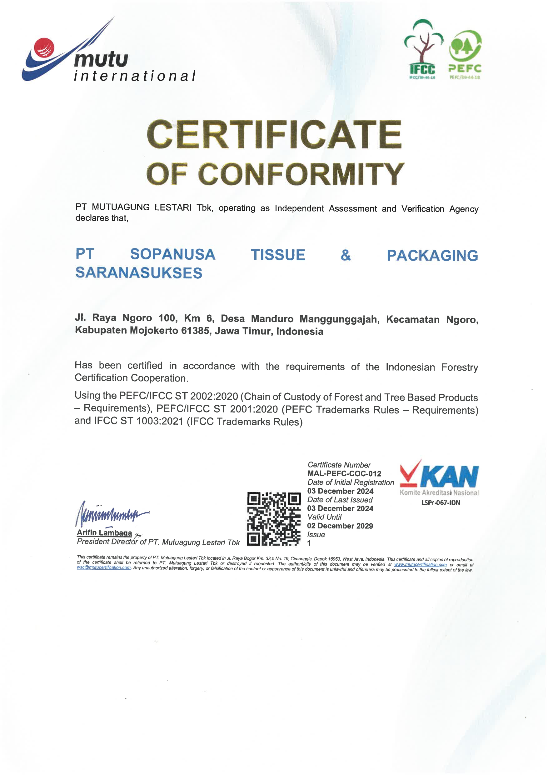 PT SOPANUSA commenced its operation in May 1995. Our company sites in the city of Mojokerto, about 55 km from East Java capital city of Surabaya. We produce all types of quality tissue paper such as Facial Tissue, Bathroom Tissue, Napkin Paper, Kitchen Towel and Hand Towel, from 11 to 50 gsm, one to three plies paper.
